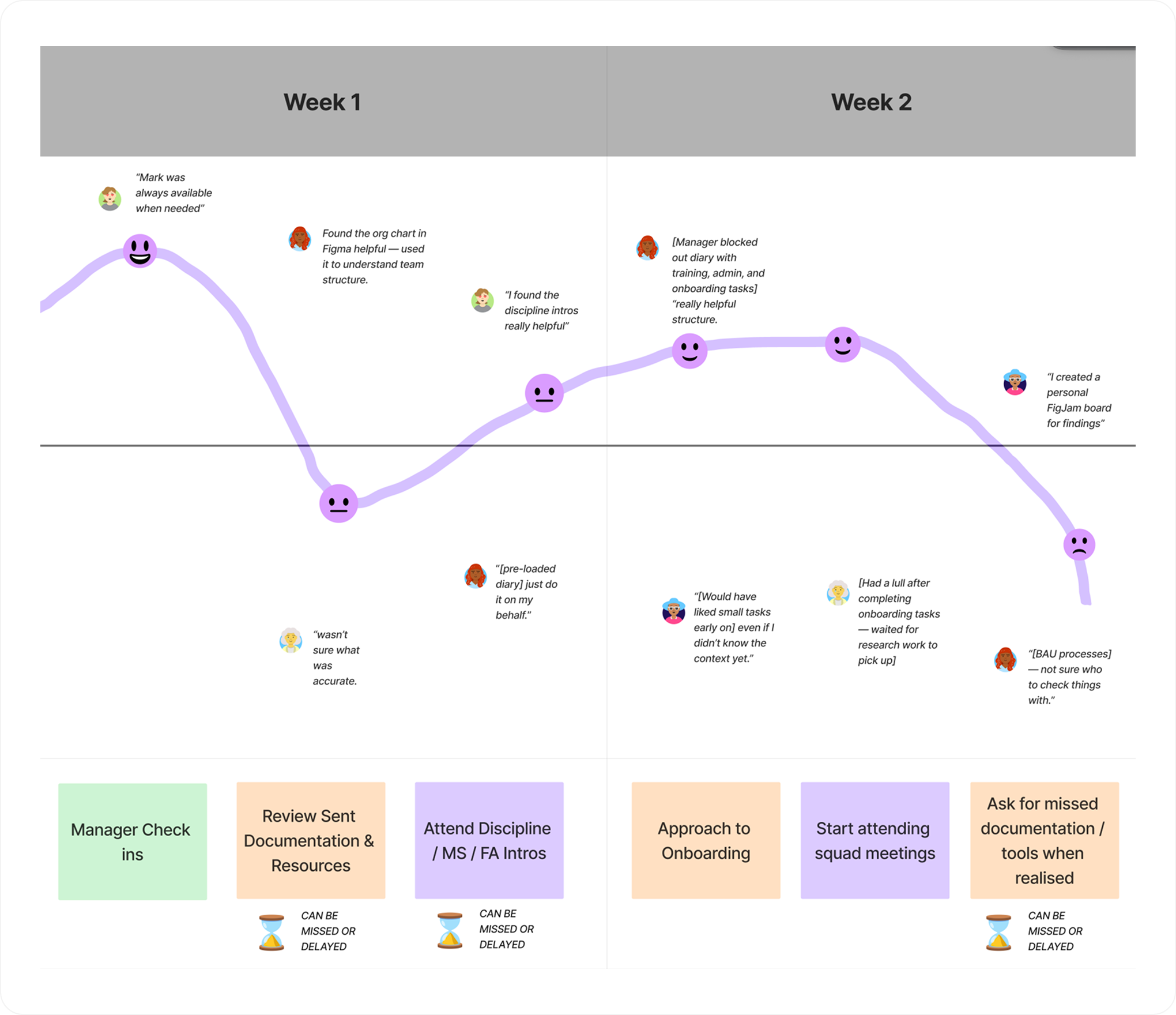 I developed a detailed user journey map to visualise the onboarding experience and identify key areas of friction against steps which rolled up to the actionable themes, and archetypes, to give several layers of insights. This covered from pre-start to week 2.
